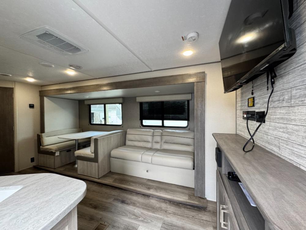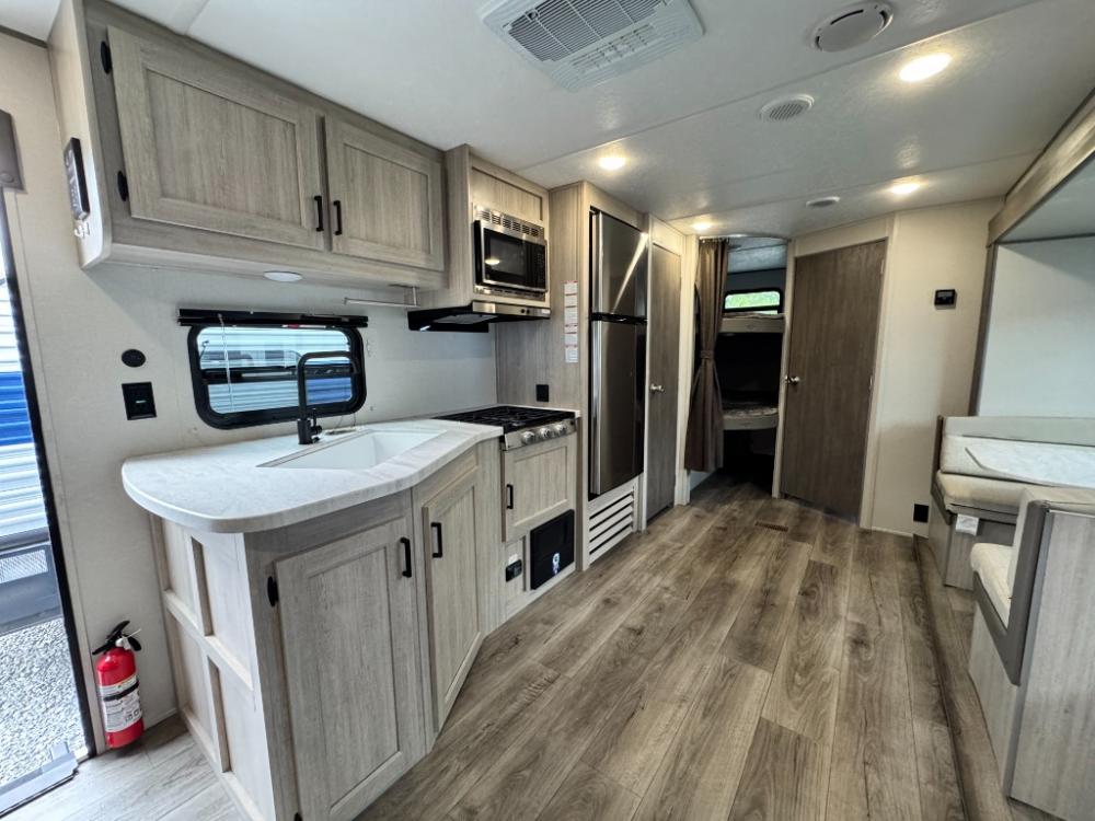 This is the perfect mid-size travel trailer for you and your family! The 46" x 74" double-size bunk beds with lower interior storage offer a comfortable sleeping space for the kids and you will have your own private sleeping space with the 60" x 74" queen bed in the front bedroom. Freshen up each morning in the rear corner bathroom with the tub/shower and a mirror to get ready each morning. You can prepare your best home cooked meals with the GE stainless three burner cooktop and GE stainless 10.7 cu. ft. 12V refrigerator, then enjoy them together at the booth dinette. The sofa is near the entertainment center for a relaxing movie night. Don't leave any of your outdoor gear behind either, thanks to the front pass-through storage area and the exterior outside storage area. You could even add the optional outside camper kitchen to grill the catch of the day on the pull out griddle!