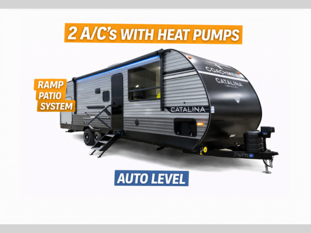 The best looking, most affordable toy hauler is found in the Catalina Trailer Blazer by Coachmen. Each one is constructed with a seamless alpha roof membrane, an enclosed and fully sealed underbelly, and a cambered structural steel I-beam frame for added support. There is a rear loading cargo door with a 3,000 lb. capacity, a black out screen wall with a zip walk-thru and windows, plus 500 lb. tie-downs to secure your toys. You'll love the interior with its Congoleum woodplank linoleum flooring and LED interior lighting. Head outside to find an electric awning with multicolored LED lights and a remote, a 15' Toy Loc cable, a "Leash Link" quick hookup D-ring for pets, and upgraded aluminum wheels. The Catalina Trail Blazer also comes with a JBL Aura Cube media center, plus premium JBL interior speakers for your pleasure!