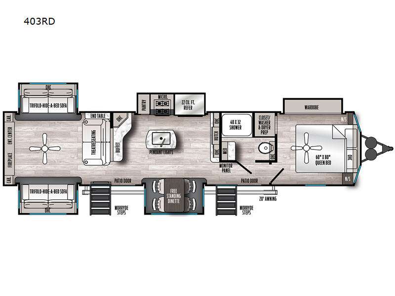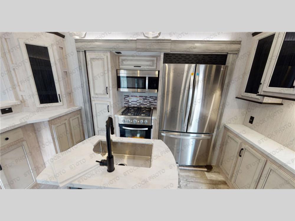 Each destination trailer features a painted full profile fiberglass front cap with a windshield, an underbelly armor, and Lippert auto adjust brakes for a smooth towing experience. Inside, you will love the solid surface kitchen countertops, residential stain resistant carpet, decorative backsplash, and many more comforts.