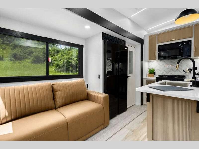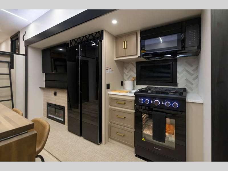 Sleeps 4 Slides 3 Length 33 ft 11 in Ext Width 8 ft Ext Height 13 ft 5 in Hitch Weight 1871 lbs Dry Weight 9380 lbs Cargo Capacity 2691 lbs Fresh Water Capacity 57 gals Grey Water Capacity 60 gals Black Water Capacity 32 gals Available Beds Custom King Refrigerator Type 12V Refrigerator Size 16 cu ft Cooktop Burners 3 Number of Awnings 1 Water Heater Type On Demand Tankless AC BTU 33000 btu TV Info LR 50" LED Smart TV Awning Info 13' with LED Lights Axle Count 2 Washer/Dryer Available Yes Shower Type Walk-In Shower Electrical Service 50 amp Similar Floorplans