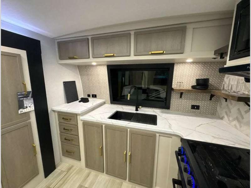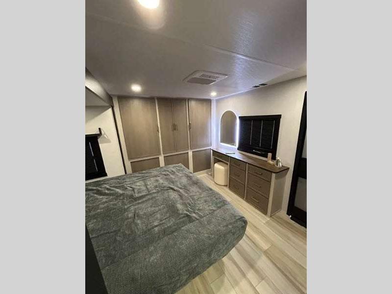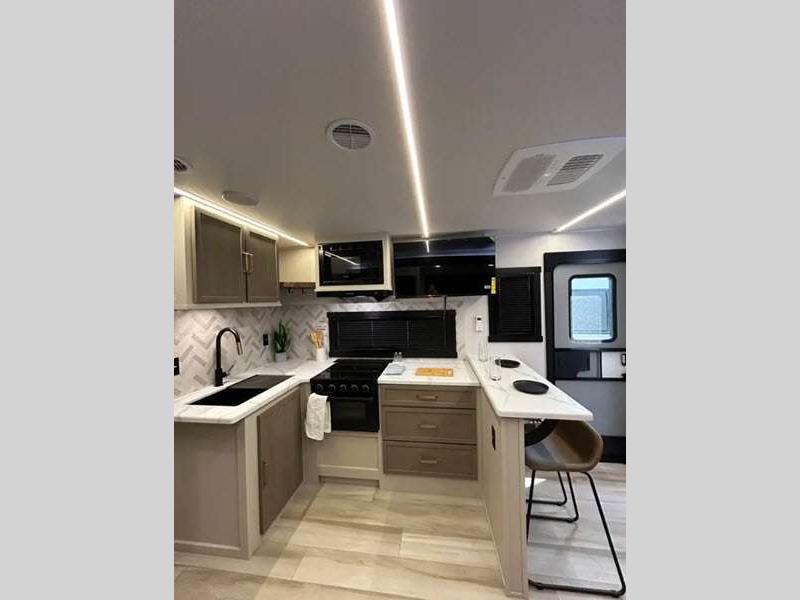 Sleeps 2 Slides 2 Length 31 ft 8 in Ext Width 8 ft Ext Height 11 ft 6 in Hitch Weight 1020 lbs Dry Weight 7563 lbs Cargo Capacity 2257 lbs Fresh Water Capacity 45 gals Grey Water Capacity 60 gals Black Water Capacity 30 gals Available Beds Custom King Refrigerator Type 12V Refrigerator Size 10 cu ft Cooktop Burners 3 Number of Awnings 1 Water Heater Type On Demand Tankless AC BTU 18000 btu TV Info 40" LED Smart TV Awning Info 22' with LED Lights Axle Count 2 Washer/Dryer Available Yes Shower Type Walk-In Shower Electrical Service 50 amp Similar Floorplans
