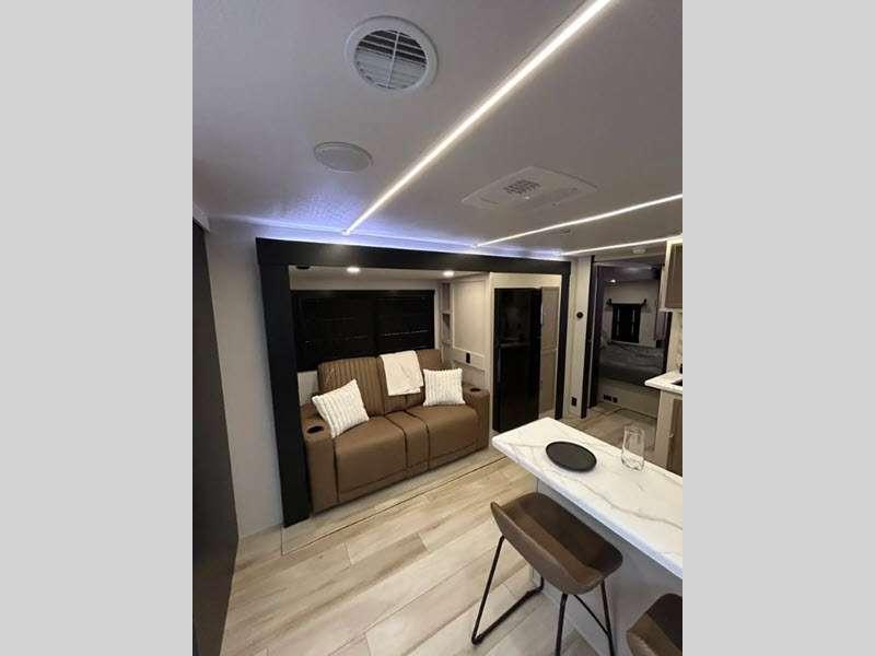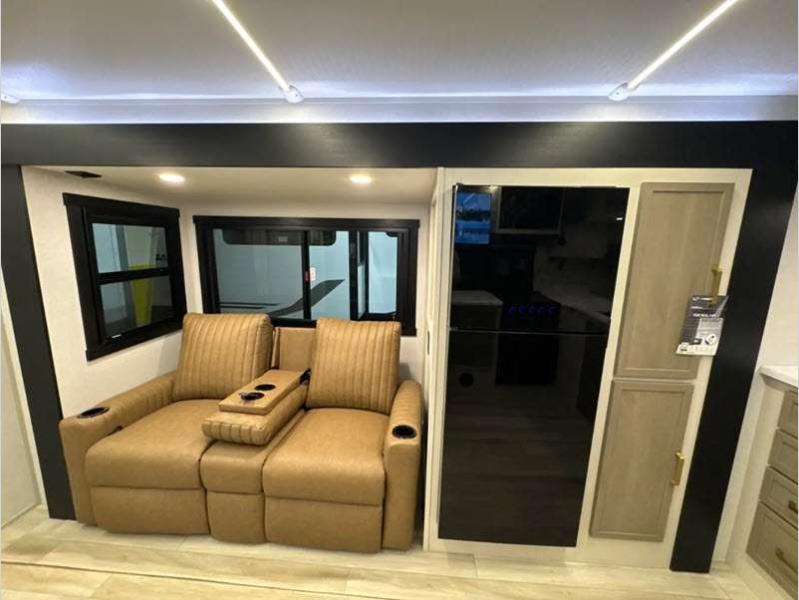 Sleeps 7 Slides 3 Length 38 ft 1 in Ext Width 8 ft Ext Height 11 ft 8 in Hitch Weight 1245 lbs Dry Weight 9333 lbs Cargo Capacity 2112 lbs Fresh Water Capacity 45 gals Grey Water Capacity 66 gals Black Water Capacity 30 gals Number Of Bunks 2 Available Beds Queen Refrigerator Type 12V Refrigerator Size 10 cu ft Cooktop Burners 3 Shower Size 30" x 36" Number of Awnings 2 Water Heater Type On Demand Tankless AC BTU 31500 btu TV Info LR 50" LED Smart TV Awning Info 10' and 12' with LED Lights Axle Count 2 Washer/Dryer Available Yes Shower Type Standard Electrical Service 50 amp Similar Floorplans