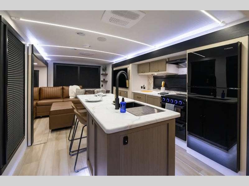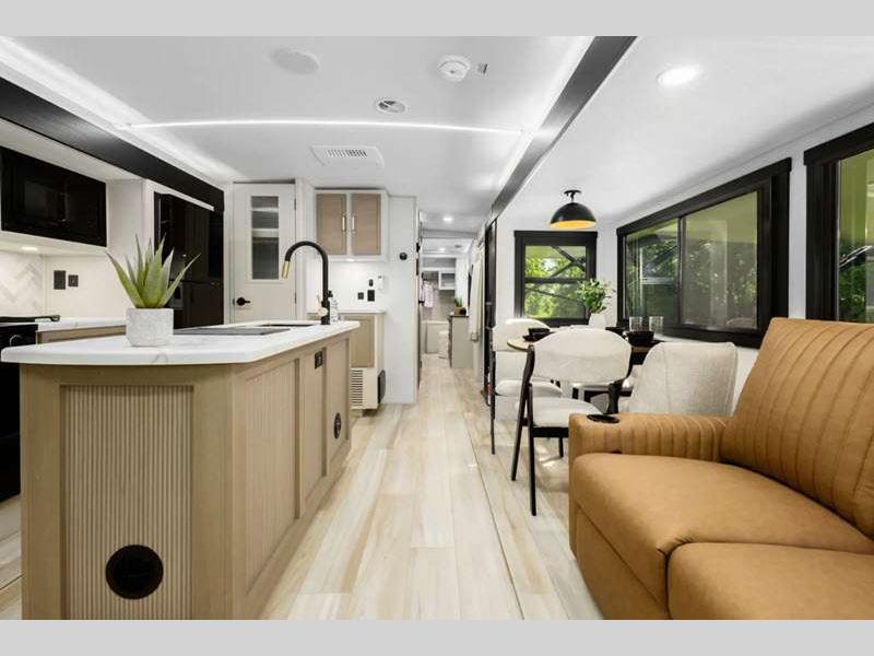 Sleeps 5 Slides 3 Length 38 ft Ext Width 8 ft Ext Height 11 ft 8 in Hitch Weight 1185 lbs Dry Weight 9543 lbs Cargo Capacity 1842 lbs Fresh Water Capacity 45 gals Grey Water Capacity 90 gals Black Water Capacity 30 gals Available Beds King Refrigerator Type 12V Refrigerator Size 10 cu ft Cooktop Burners 3 Number of Awnings 2 Water Heater Type On Demand Tankless AC BTU 31500 btu TV Info LR 50" LED Smart TV Awning Info 12' and 14' with LED Lights Axle Count 2 Washer/Dryer Available Yes Shower Type Standard Electrical Service 50 amp Similar Floorplans
