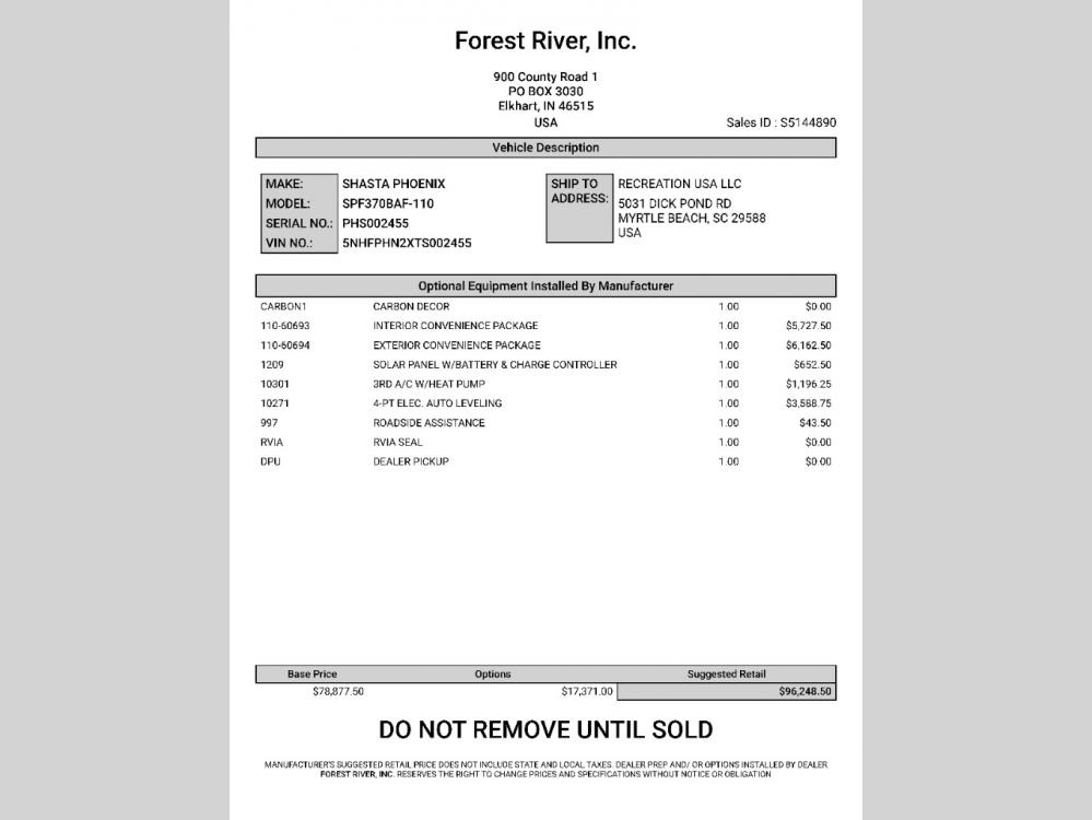 Stock #15541South Myrtle Beach, SCFREIGHT, PREP, DETAIL AND WALK-THROUGH INCLUDED! ALSO, NATIONAL SHIPPING AVAILABLE!Stock #15541South Myrtle Beach, SCFREIGHT, PREP, DETAIL AND WALK-THROUGH INCLUDED! ALSO, NATIONAL SHIPPING AVAILABLE!
